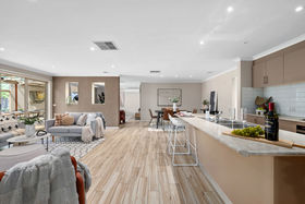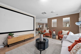 Sitting in the heart of the home you will find the first living area, with plenty of space on offer and also is accompanied by the dining area. This is overlooked by the kitchen which features ample bench and cabinet space, stainless steel appliances, dishwasher, and a hidden walk-in pantry perfect for extra storage. This is all finished off with the formal living area at the rear of the home, which features a projector and screen perfect for the family movie night.